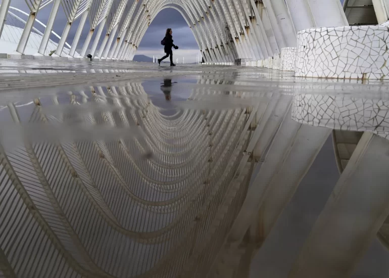 A woman is reflected on rain water as she walks inside the modern Agora walkway at the main Olympic complex in Athens, Greece. (October 14, 2021)