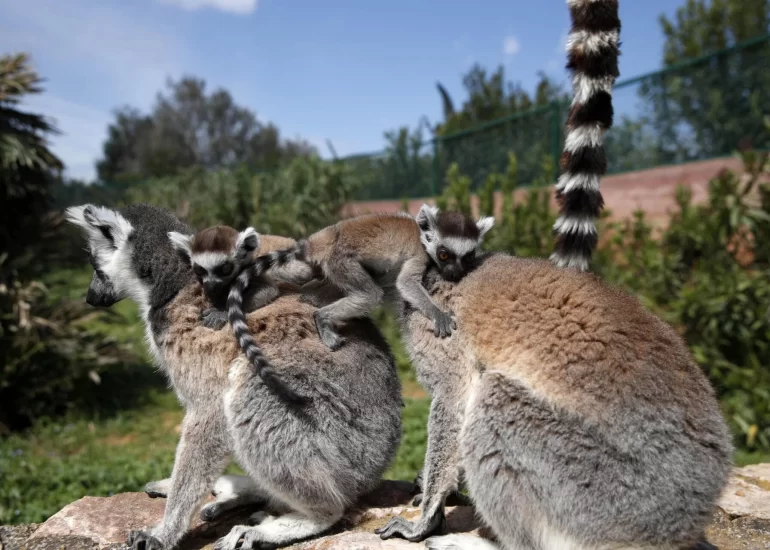 Newborn ring-tailed lemurs play inside the shuttered Attica Zoological Park, in Spata, east of Athens. (April 23, 2020)
