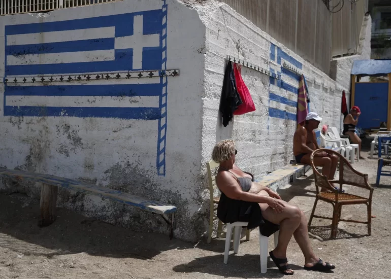 People enjoy the sun on a small beach as Greek flags are painted on the wall during a warm day in Piraeus, near Athens on Wednesday. (May 20, 2020)