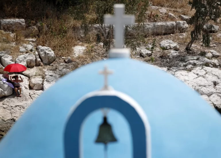 A woman enjoys the sun on a small beach as a Greek Orthodox chapel is seen the foreground during a warm day in Piraeus, near Athens. (May 20, 2020)