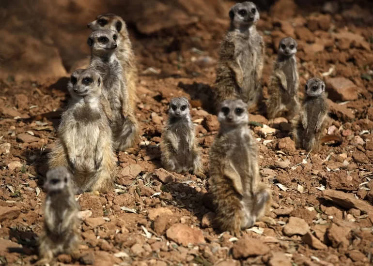 Newborn meerkats stand among others inside the shuttered Attica Zoological Park, in Spata, east of Athens, on Thursday, April 23, 2020)