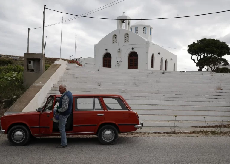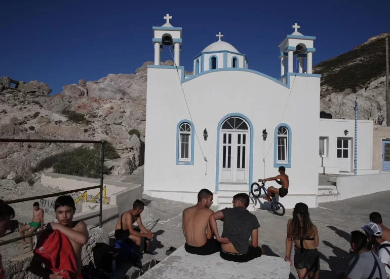 Children gather in front of a Greek Orthodox church on the Aegean Sea island of Milos, Greece. (May 24, 2020)
