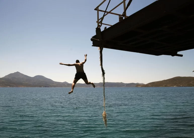 A boy dives into the sea from an old dock on the Aegean Sea island of Milos, Greece, (May 24, 2020)