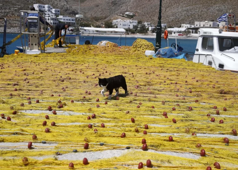 A cat walks on fishermen’s nets on the Aegean Sea island of Folegandros, Greece. (May 25, 2020)