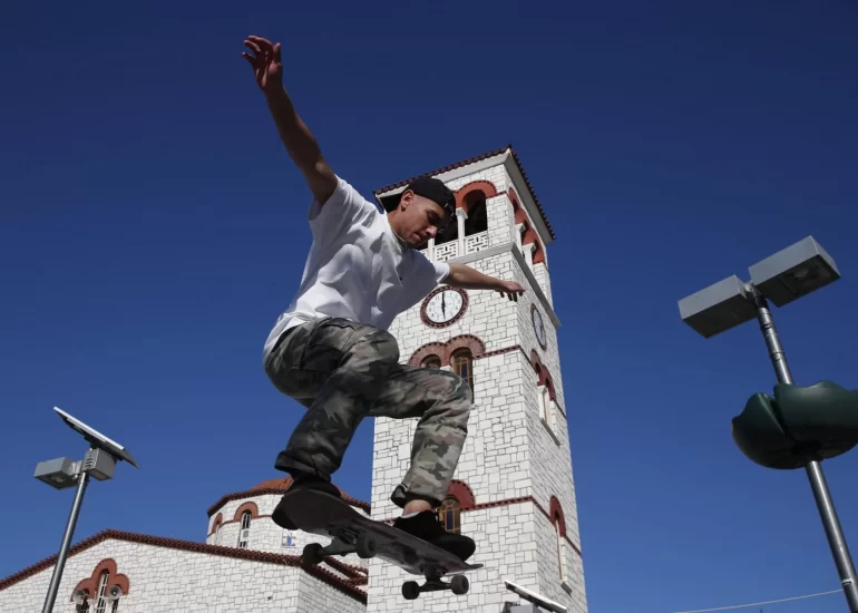 Kosmas Giannikos, 19, jumps with his skateboard in front of the Greek Orthodox church of Analipsi in northern Athens, (April 24, 2020)