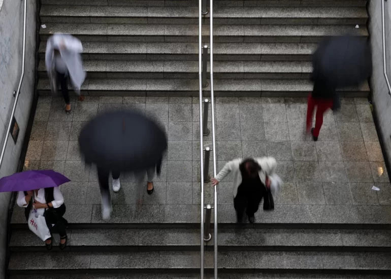 Commuters enter a metro station during a rainfall in central Athens. (October 31, 2019)