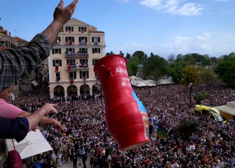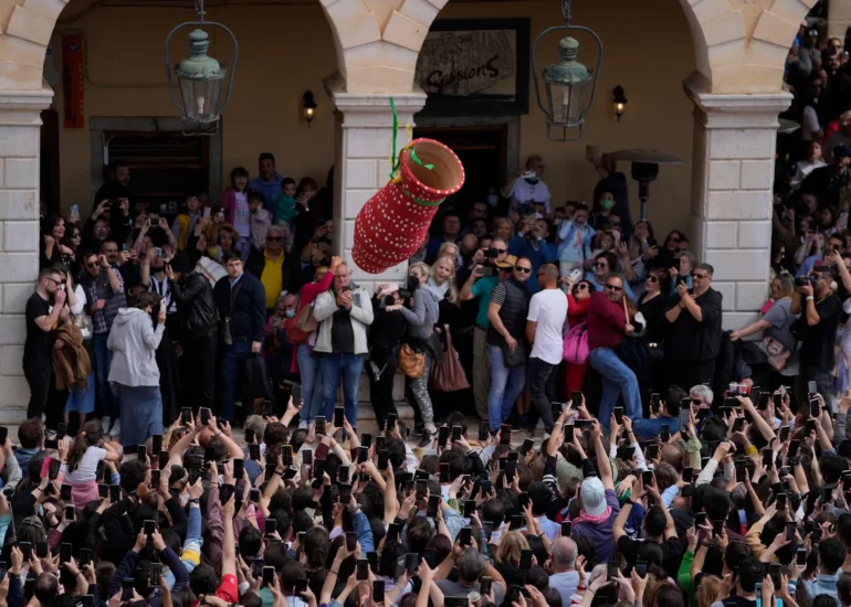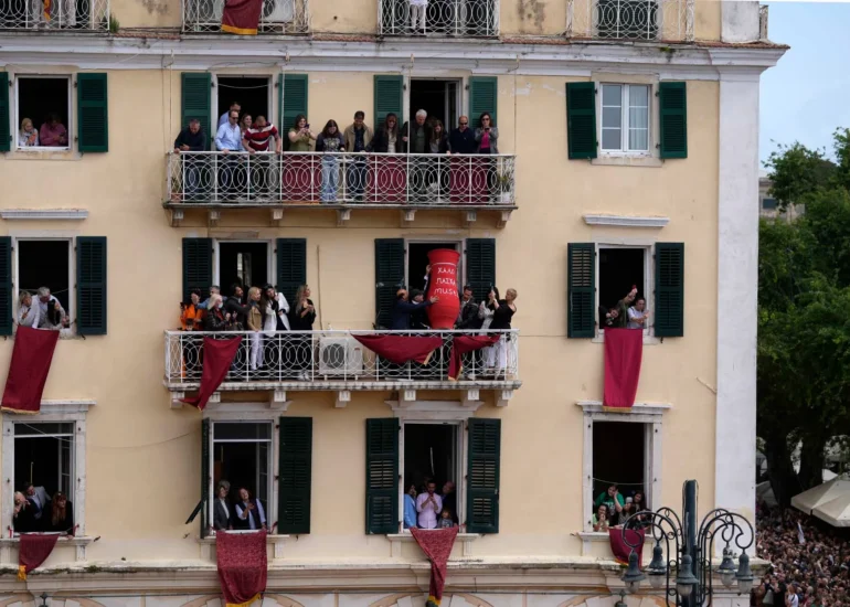 Crowds lined the old city of Corfu’s narrow streets Saturday morning for one of the most spectacular events, called ‘botides,’ that involves dropping clay jars full of water from balconies to crash with a loud bang on the streets below, spraying attendees with water. Locals consider it a miracle that there have been no serious injuries from flying clay shards. This ancient event’s original purpose was to ward off evil spirits.