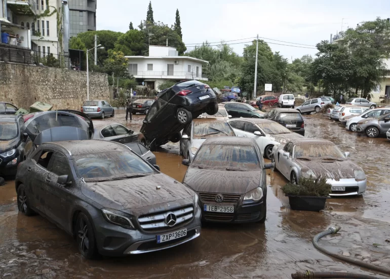 Damaged cars are strewn across an open parking area in northern Athens, after flash floods caused by a sudden downpour. (July 26, 2018)
