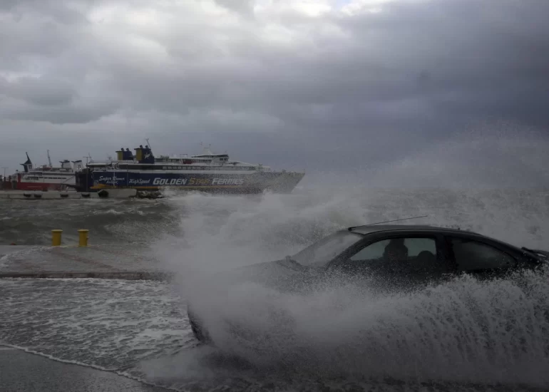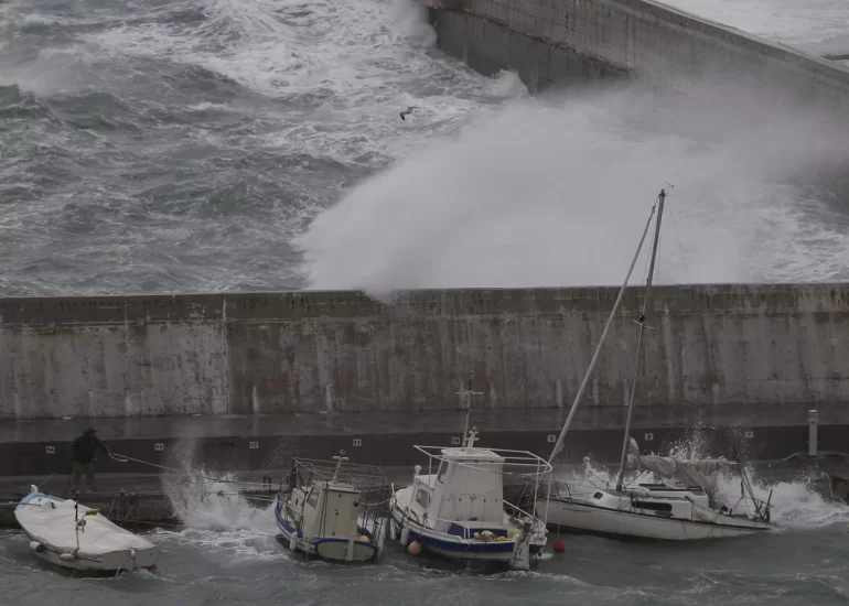 A man tries to secure a boat due to bad weather at the port of Rafina, east of Athens. (September 27, 2018)
