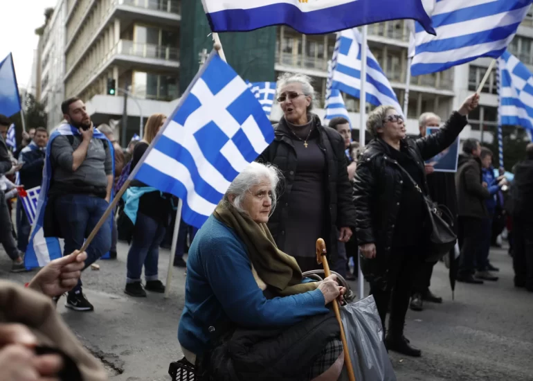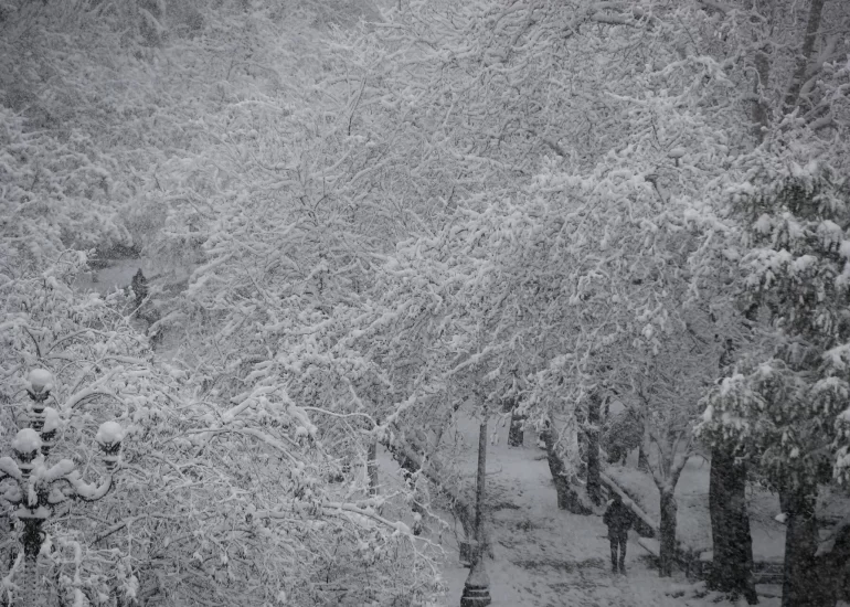 Pedestrians walk outside the snow covered National Garden in central Athens, Greece. (February 16, 2021)