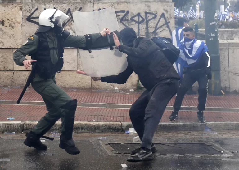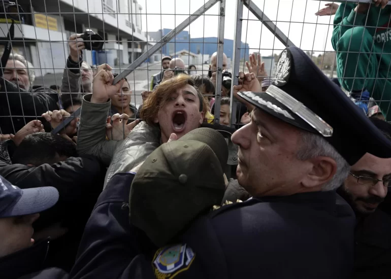Police scuffle with Afghan migrants as they block the entrance of the Hellenikon migrant camp during the visit of Migration Minister Yannis Mouzalas, in southern Athens. (February 6, 2017)