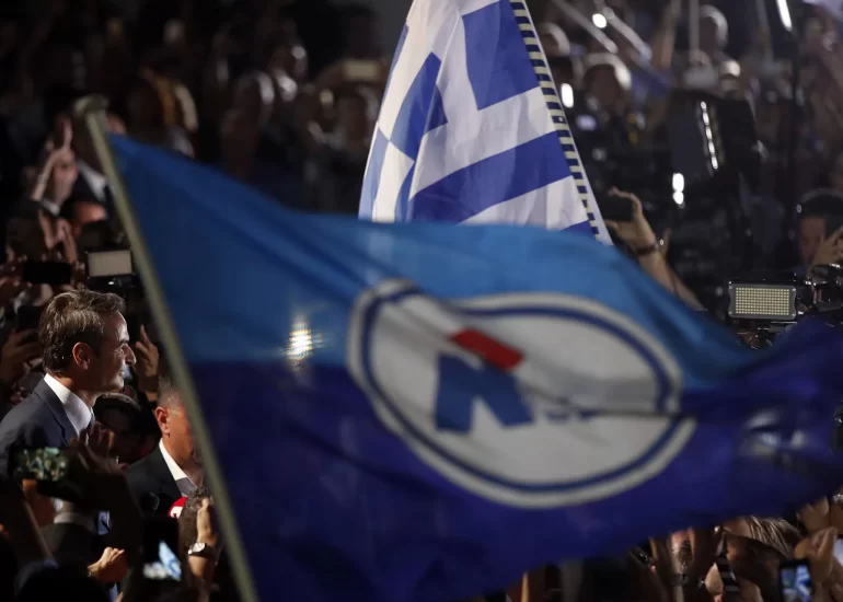 Greek opposition New Democracy conservative party leader Kyriakos Mitsotakis, left, talks to his supporters after win the parliamentary elections at the New Democracy headquarters in Athens. (July 7, 2019)