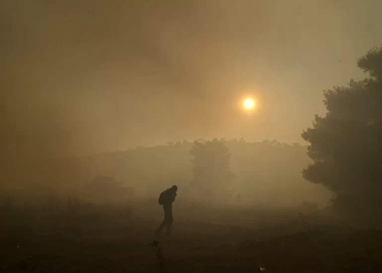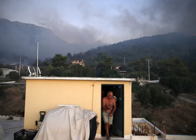 A local resident walks out of the rooftop of his house during a wildfire in Peania, eastern Athens. (August 12, 2019)