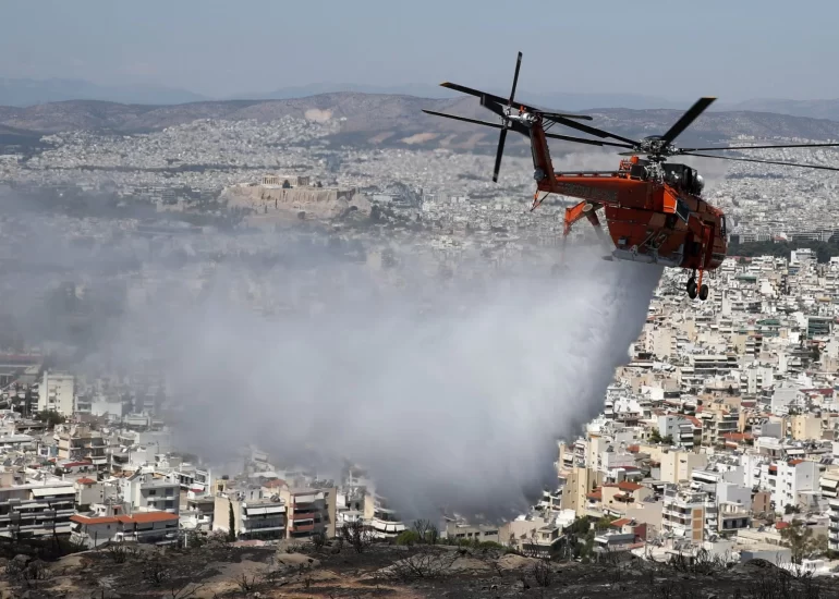 An helicopter drops water over a hill after a wildfire in the eastern Athens suburb of Vironas as the ancient Acropolis hill is seen in the background. (August 28, 2019)