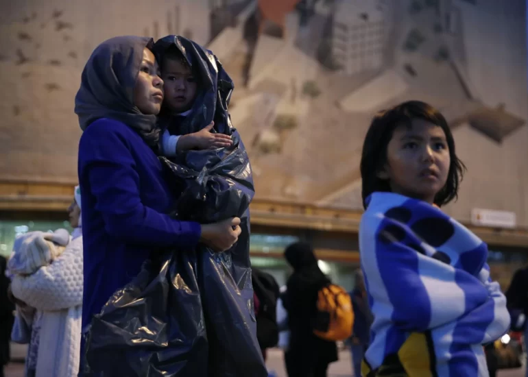 An Afghan woman holds her child upon their arrival from Lesbos island to the port of Piraeus, near Athens. (October 7, 2019)