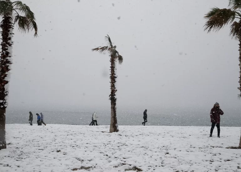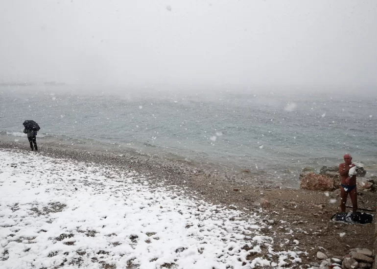 People walk on the snow covered beach of Edem in Paleo Faliro suburb, in Athens, Greece. (February 16, 2021)