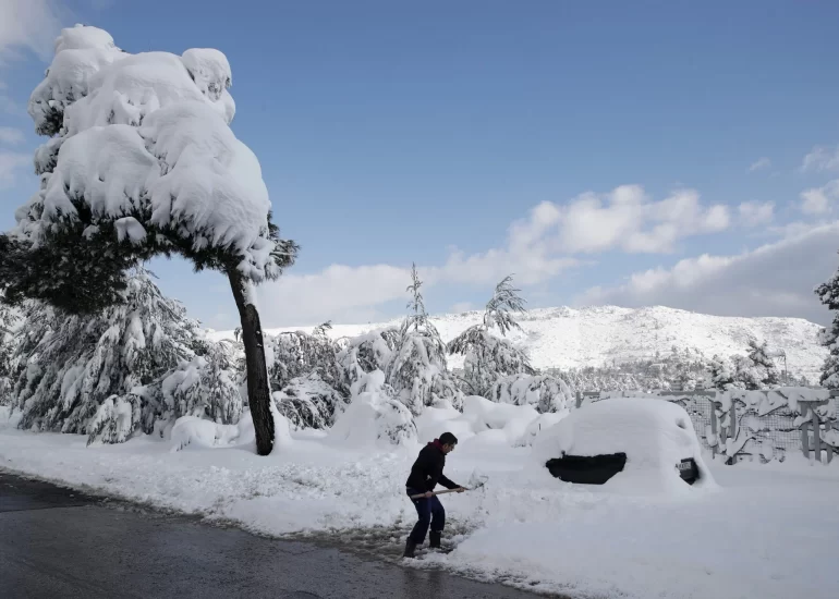 A man clears snow from outside his house after a heavy snowfall in Dionysos suburb, northern Athens, Greece. (February 17, 2021)