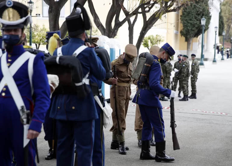 Members of the Greek Army prepare for the parade in Athens, Greece. (March 25, 2021)