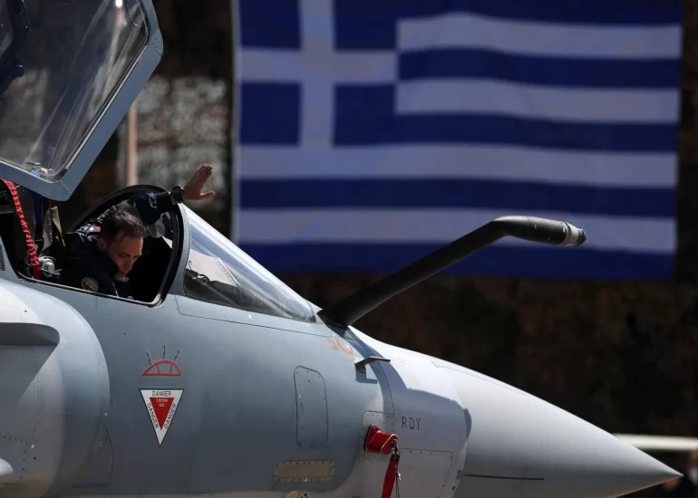 A Greek pilot of a Mirage 2000-5 gives directions to a ground crew member at Andravida air base, about 279 kilometres (174 miles) southwest of Athens, Greece. (April 20, 2021)