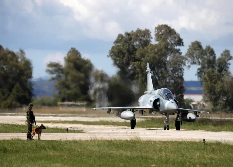 A Greek crew of a Mirage 2000-5 taxis as a soldier with a dog guards at Andravida air base, about 279 kilometres (174 miles) southwest of Athens, Greece. (April 20, 2021)