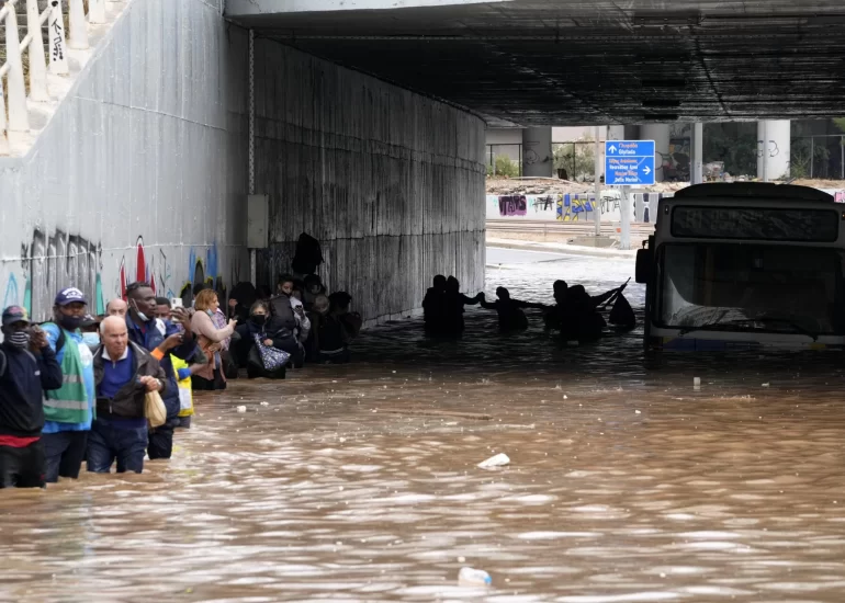 Passengers wade through high water as they evacuate a bus stuck in a flooded underpass in southern Athens, Greece. (October 14, 2021)