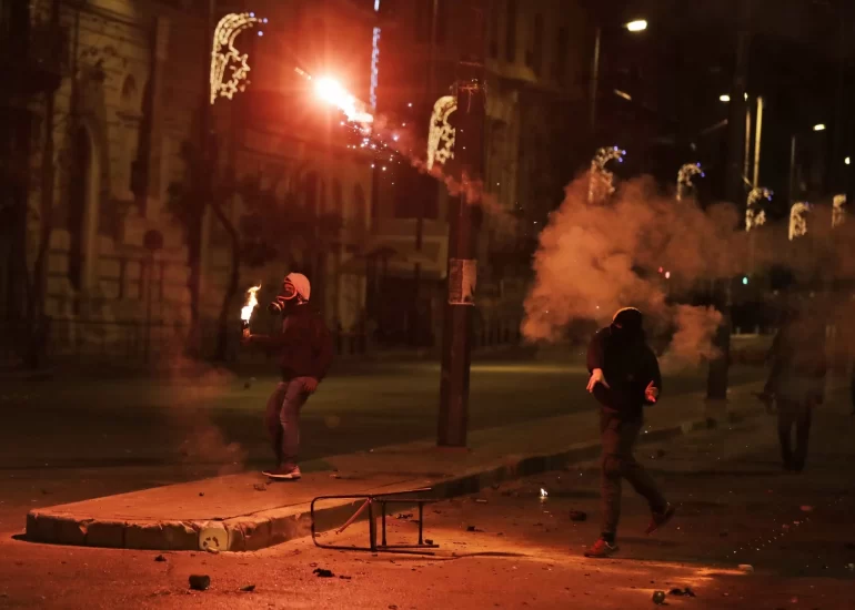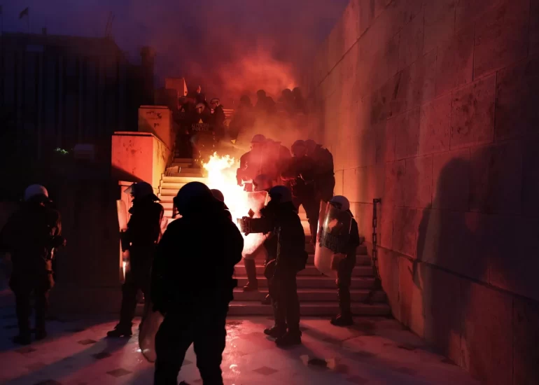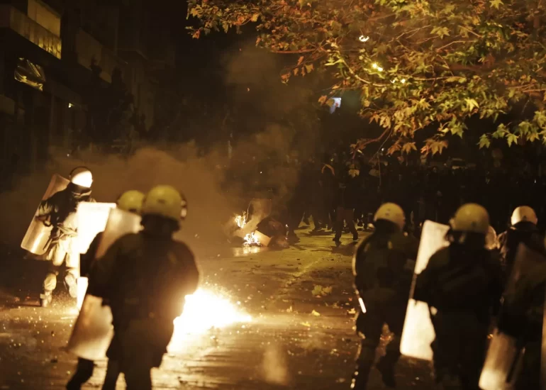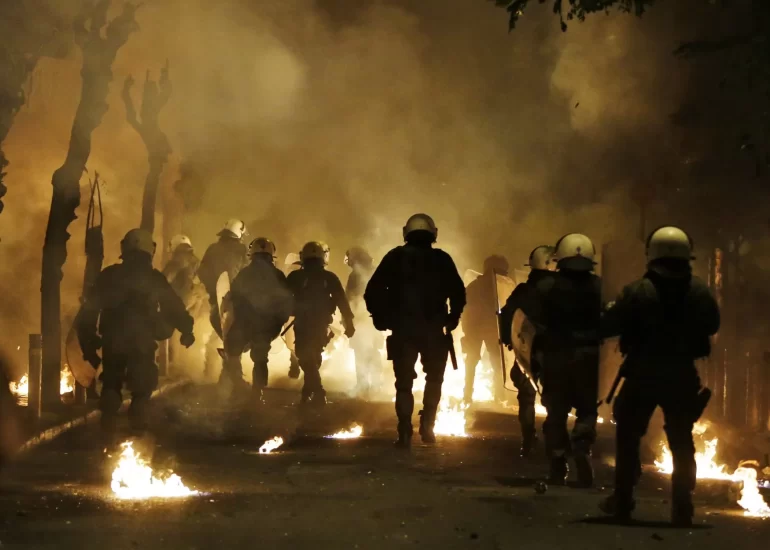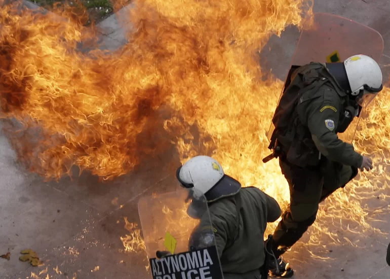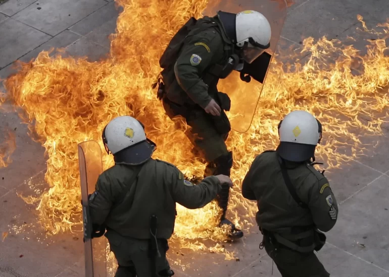 Amidst tear gas fired by them earlier and fire from firebombs brown by protesters riot police operate in Athens during the ninth anniversary of the fatal police shooting of a teenager. (December 6, 2017)