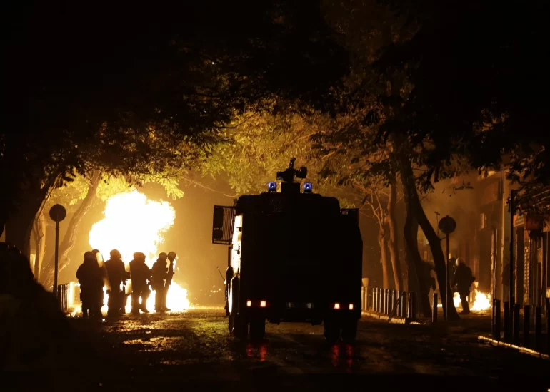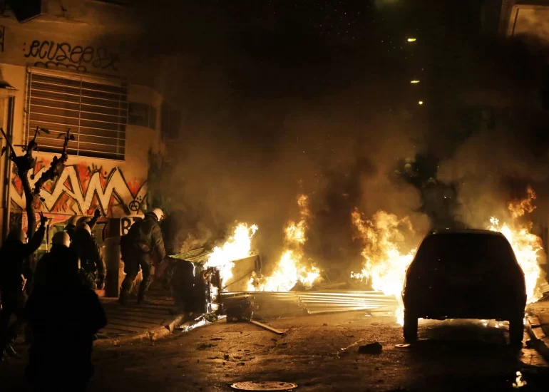 Riot police hold their positions next to fire from firebombs thrown by protesters, engulfing vehicles and barricades set up by protesters, in Athens during the ninth anniversary of the fatal police shooting of a teenager. (December 6, 2017)