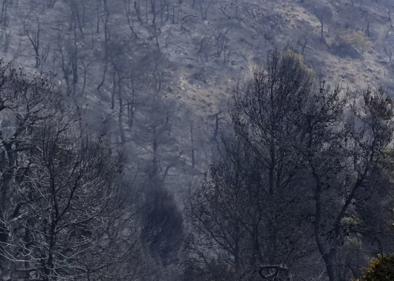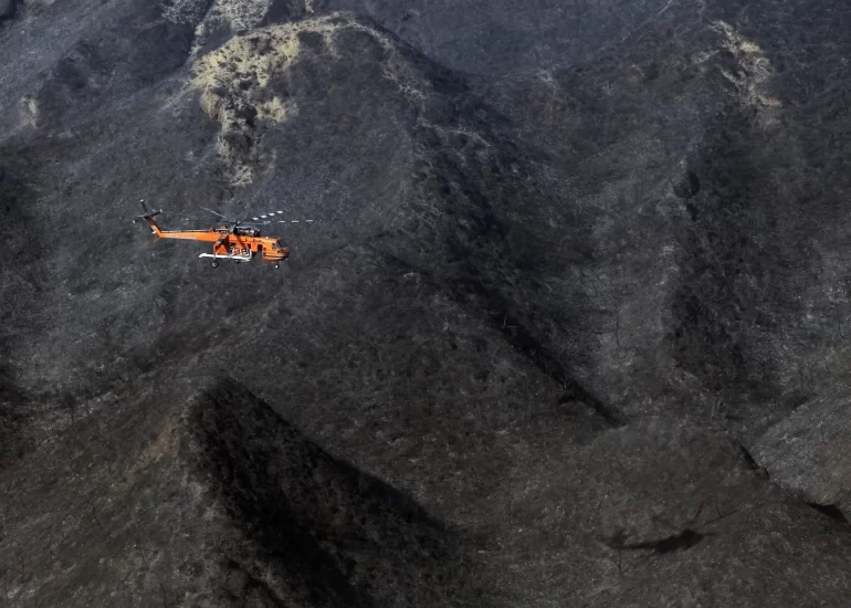 An helicopter flies over a burned mountain during a wildfire at Magoula village, near the western Greek port city of Patras. (July 18, 2012)