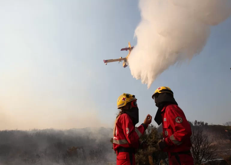 Aircraft drop water over a forest fire as a firefighter gives directions to a colleague during a wildfire at Magoula village, near the western Greek port city of Patras. (July 18, 2012)