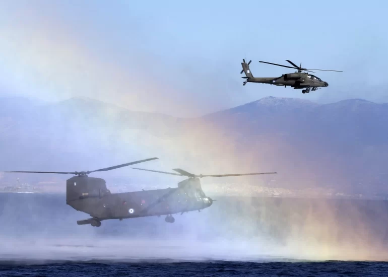 Military helicopters operate during a Greek joint military exercise ''Pyrpolitis'' at the Saronic Gulf, south of Athens on Thursday, (October 30, 2014)