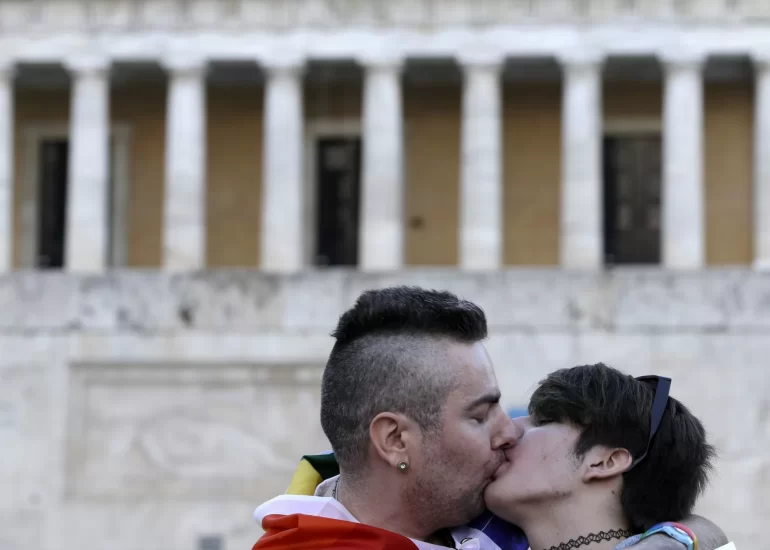 A gay couple kisses during a protest outside Greece's Parliament in Athens. (September 5, 2014)