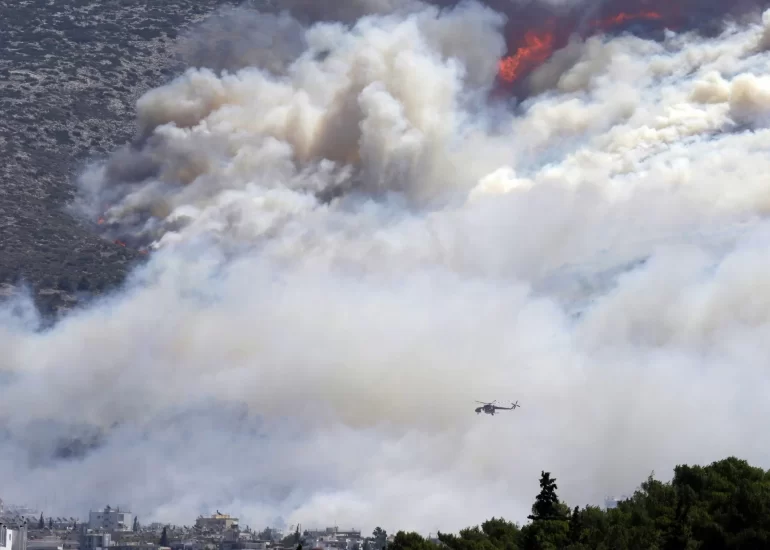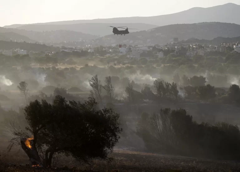 A helicopter operates during a wildfire over Kalyvia area some 30 kilometers (18 miles) south of Athens. (July 31, 2017)