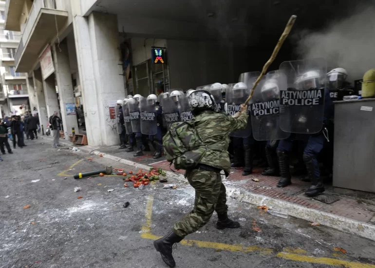 A farmer clashes with riot police during a protest outside Agriculture ministry in Athens. (February 12, 2016)