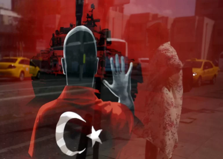 A woman is reflected in a poster made for an anti-coup rally, at Taksim Square in Istanbul. (August 8, 2016)
