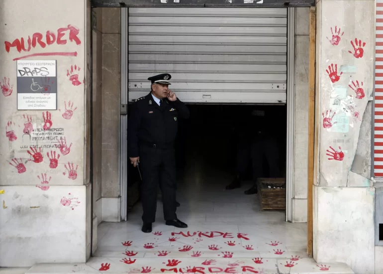A police officer speaks on his cell phone during a rally outside the Migration Ministry in Athens, to protest against camp conditions after the deaths of five migrants this winter at the refugee camps in Greece. (February 2017)