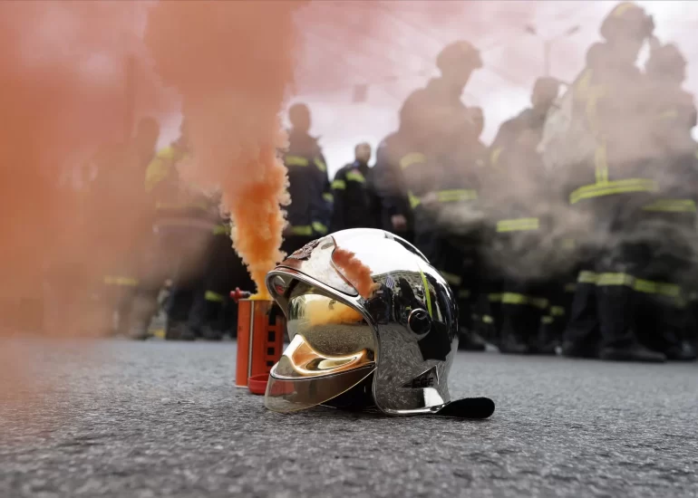 A firefighter's helmet stands next to a flare during a protest in central Athens. (February 8, 2017)