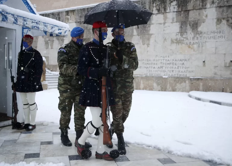 Soldiers help a member of the Presidential Guard, known as Evzonas, during the changing of the guard as snow falls at the tomb of the Unknown Soldier in Athens, Greece. (February 16, 2021)