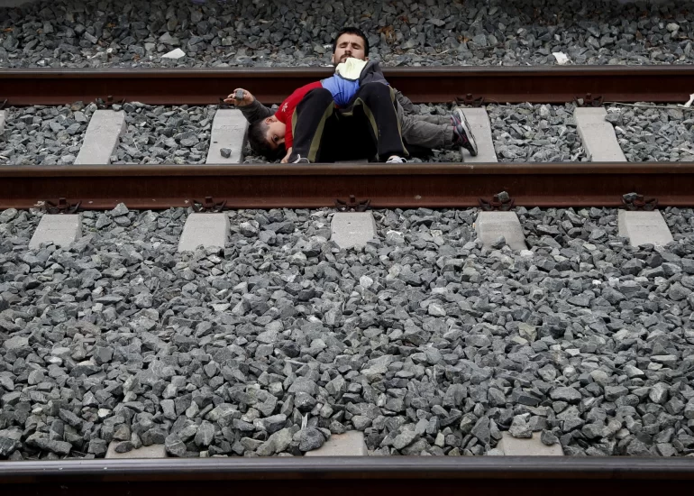 A migrant father with his child lays on the rail tracks at the main train station of in Athens during a rally. (April 5, 2019)