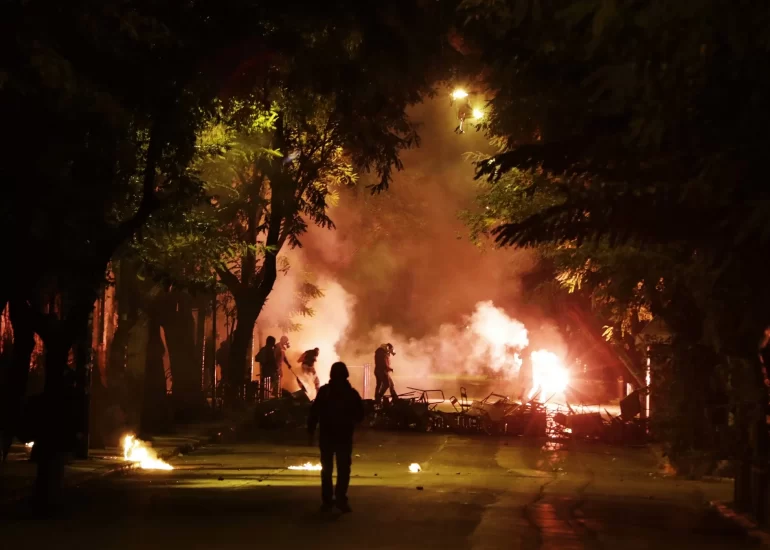 Protesters light fires amidst clouds of tear gas fired by police during small scale clashes, outside Athens' Polytechnic University complex. (November 17, 2016)