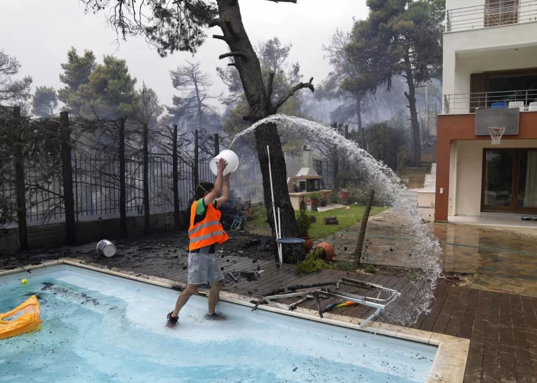 A man throws water from a swimming pool as the fire approaches his house in Ippokratios Politia village, about 35 kilometres (21 miles) north of Athens, Greece. (August 6, 2021)
