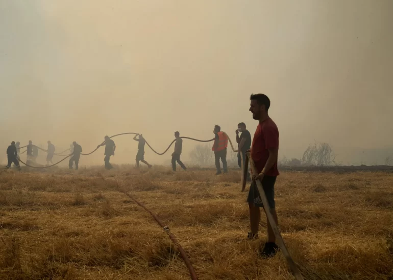 A firefighter tries to extinguish a fire as volunteers hold the water hose in Agios Stefanos, in northern Athens, Greece. (August 6, 2021)
