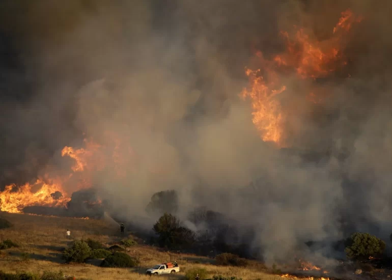 Firefighters try to extinguish a wildfire in the Kalyvia area some 30 kilometers (18 miles) south of Athens. (July 31, 2017)