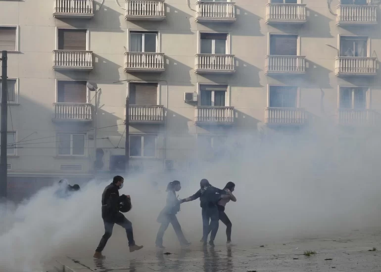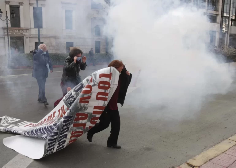 Protesters run away to avoid tear gas thrown by riot police during clashes in central Athens.(November 17, 2020)