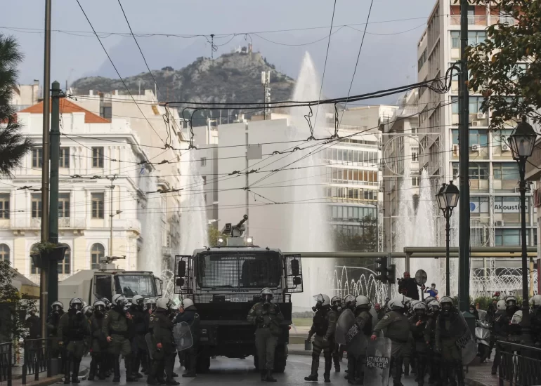 Riot police walk next a water cannon vehicle kin central Omonoia square central Athens.(November 17, 2020)