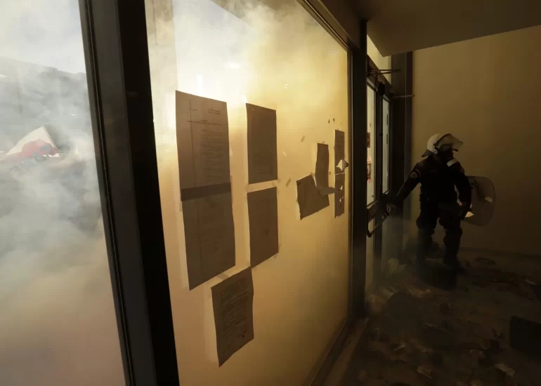 A policeman closes the door of a court as people try to avoid tear gas while dozens of protesters trying to disrupt foreclosed property auctions.(November 29, 2017)