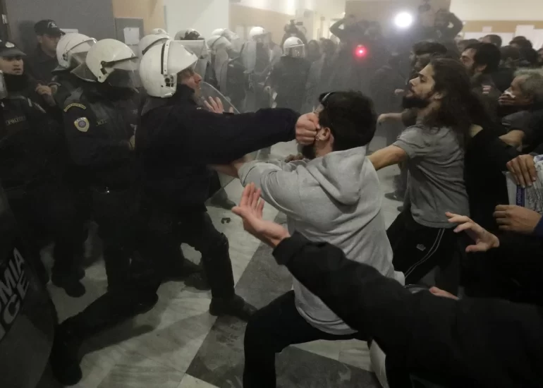 A policeman fights with a protester outside a court room in Athens as people trying to disrupt foreclosed property auctions. (November 29, 2017)