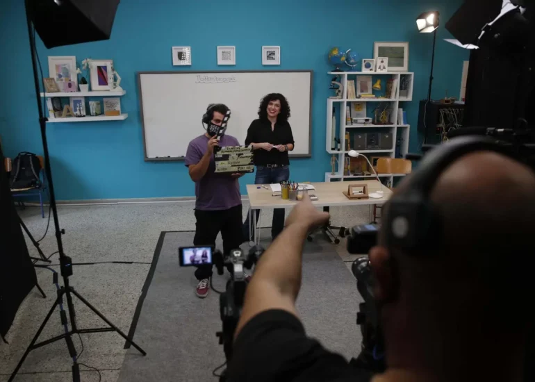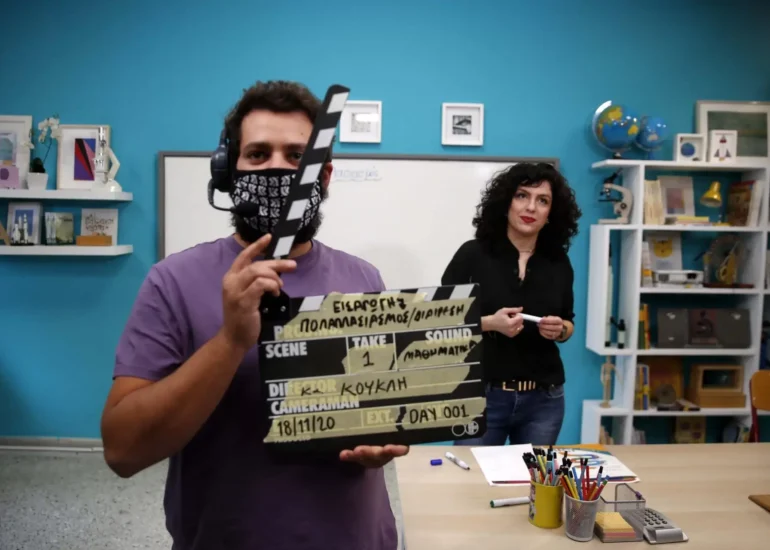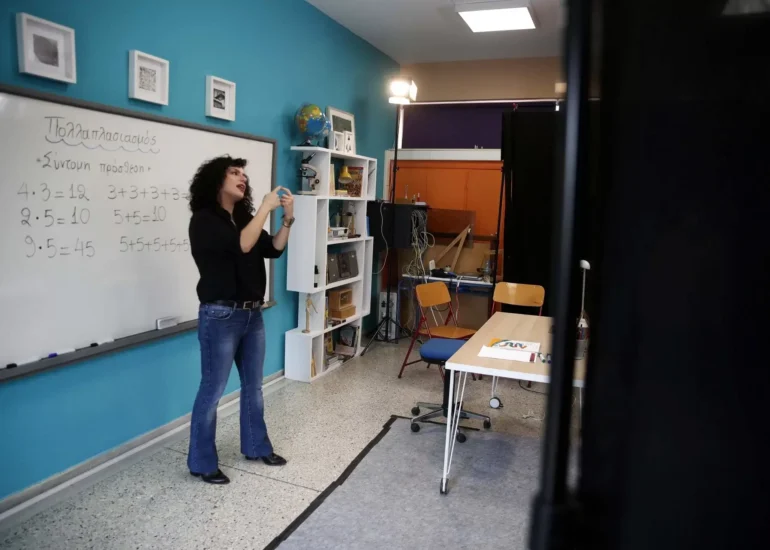 Math teacher Rania Koukli runs a YouTube education channel with her husband and was picked by a state education board to present elementary-grade lessons.