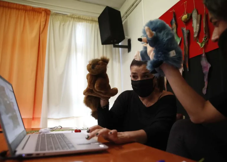 When class begins, two teachers put on raspy play-voices and let the puppets, Jo the hedgehog and Joo the squirrel, greet their preschool students — except the desks in front of them are all empty.