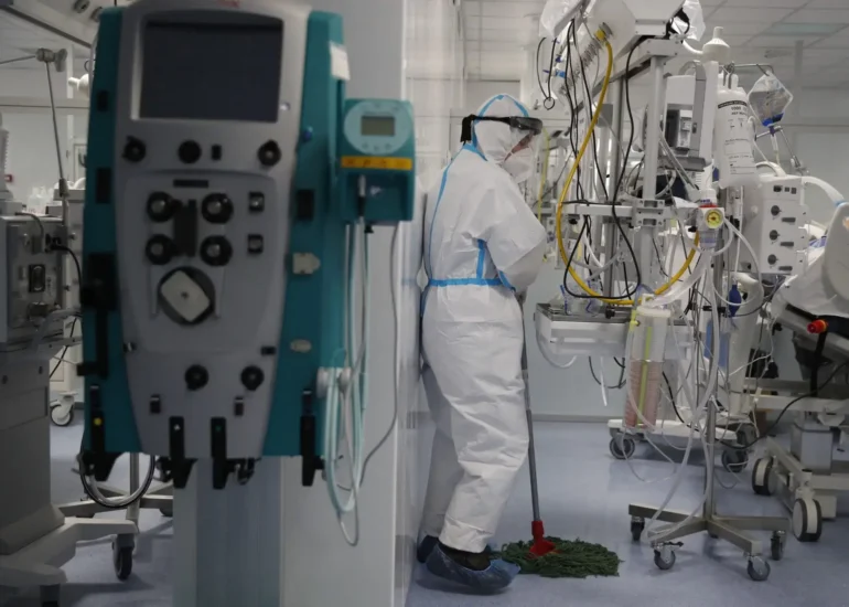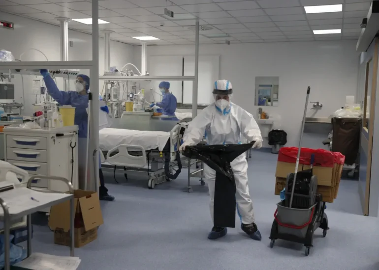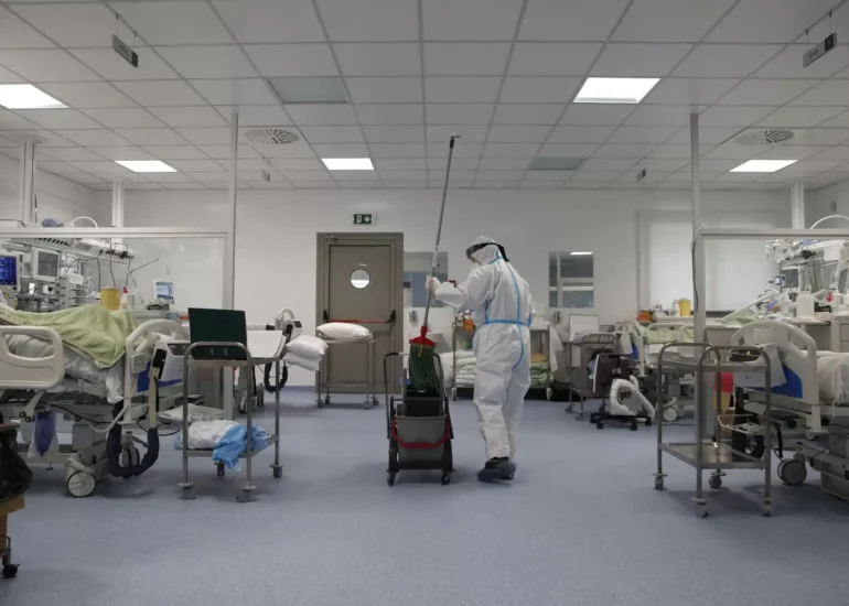 Just behind them, unnoticed and unheard, a worker in the same protective gear goes about an entirely different task: disinfecting surfaces, collecting waste in biohazard bags, unobtrusively inching past beds and life-support machinery to mop the floor.